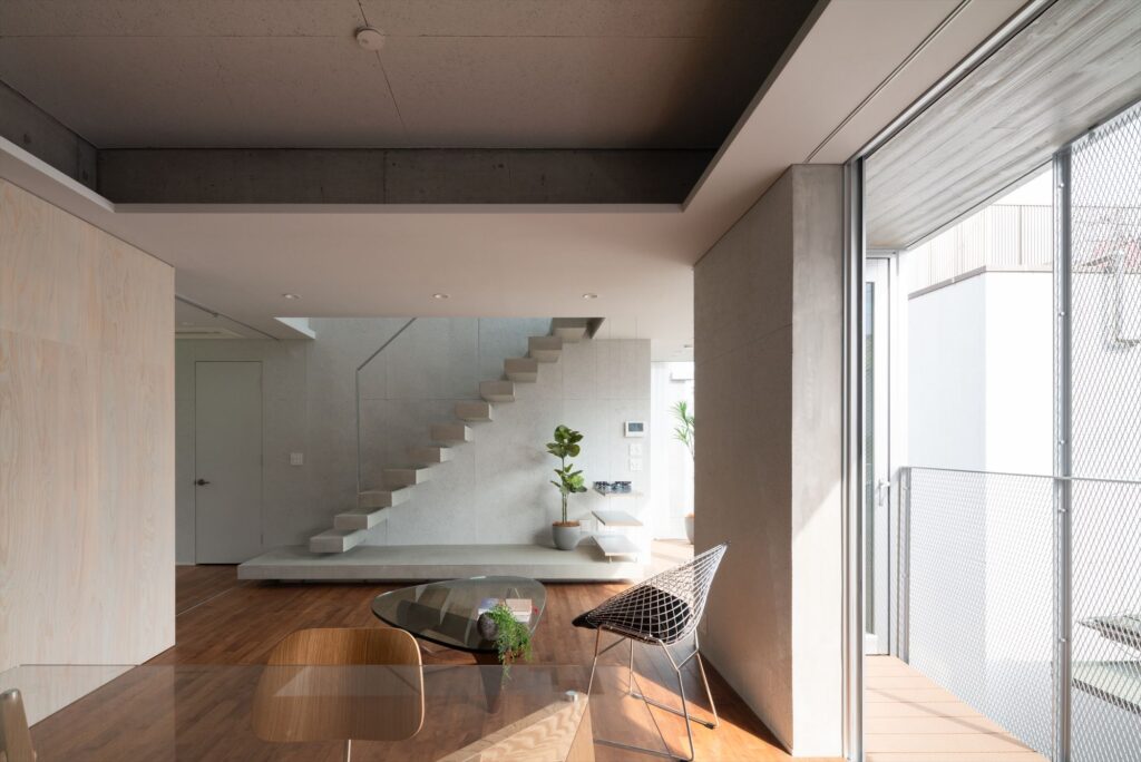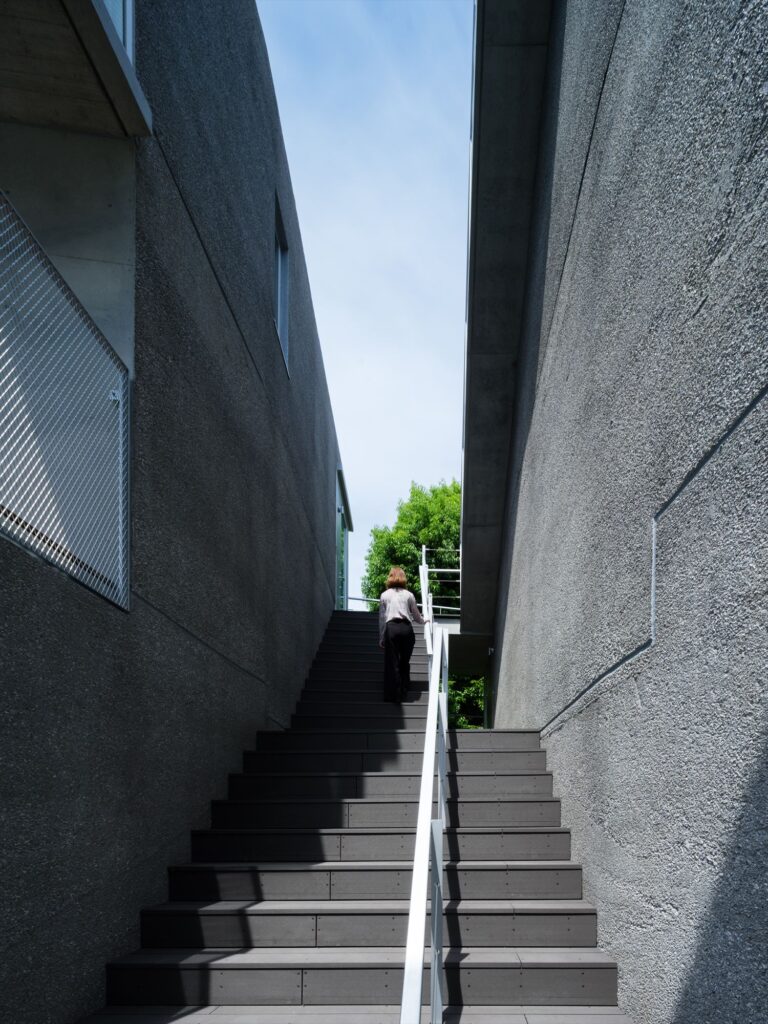 ・建物中央に設けられた、外部階段。視線の奥には隣地ポケットパークが見えます!