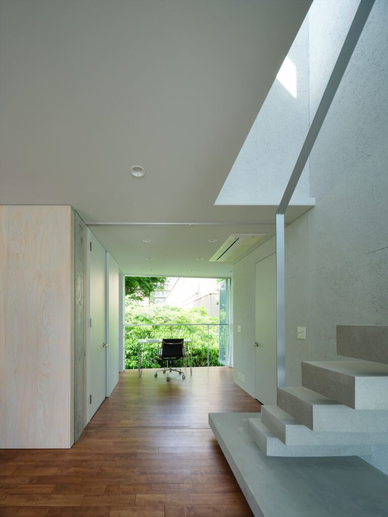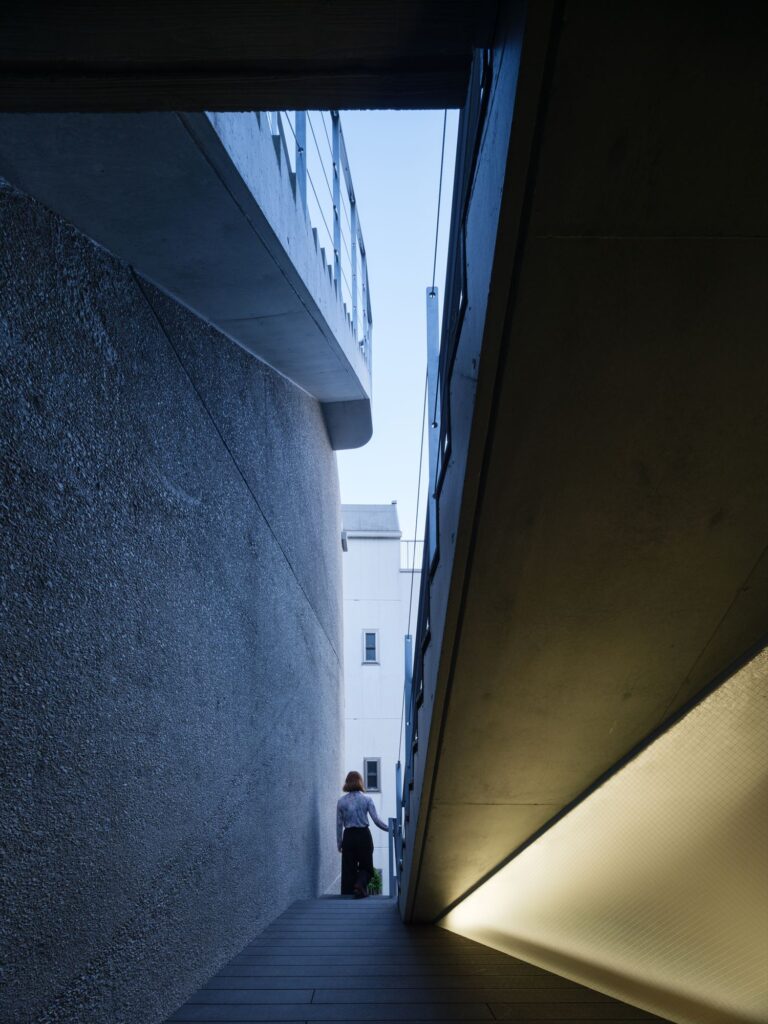 このような環境をより魅力的にするべく、建物中央にクレパスのように切り開いた外部階段とアプローチを設け、
