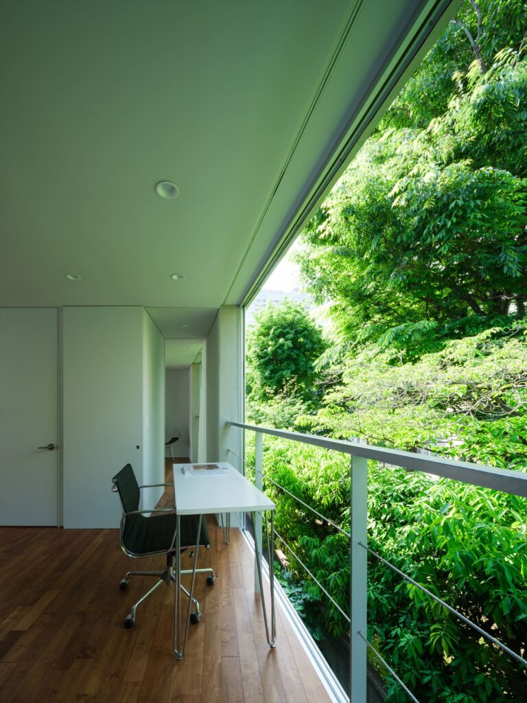 本敷地は高密度のビル、住宅地に位置し、北側には隣地の擁壁と緑豊かなポケットパークが接しています。