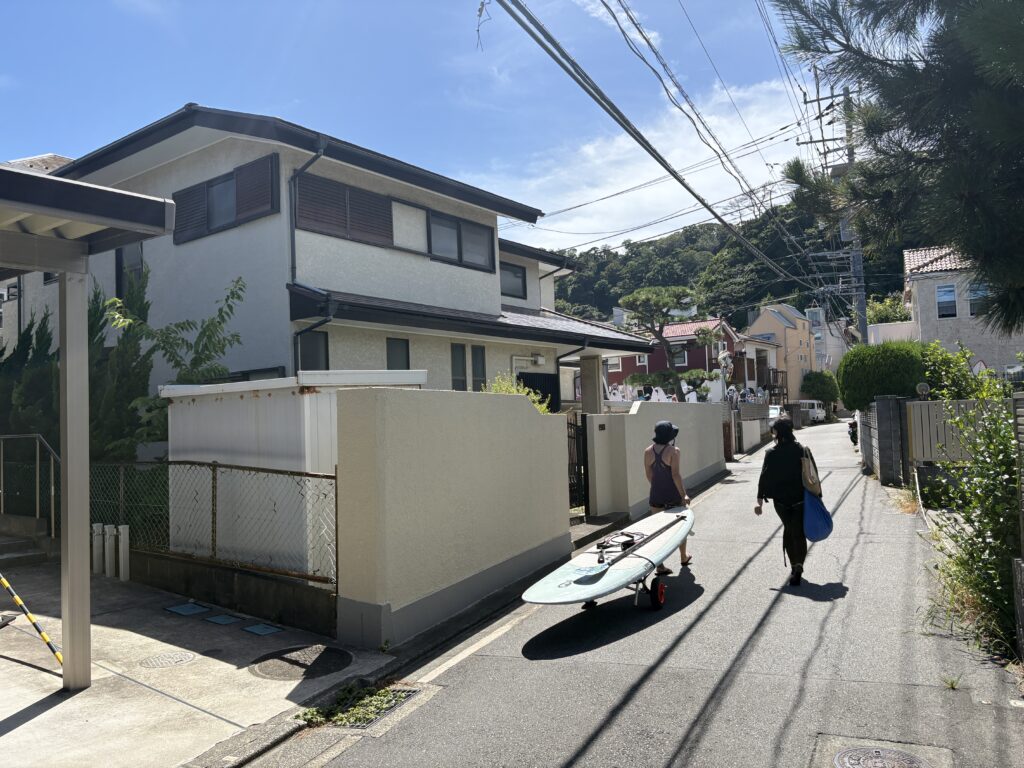 休日にはボードを手にしたサーファーが通りを行き来しています。
